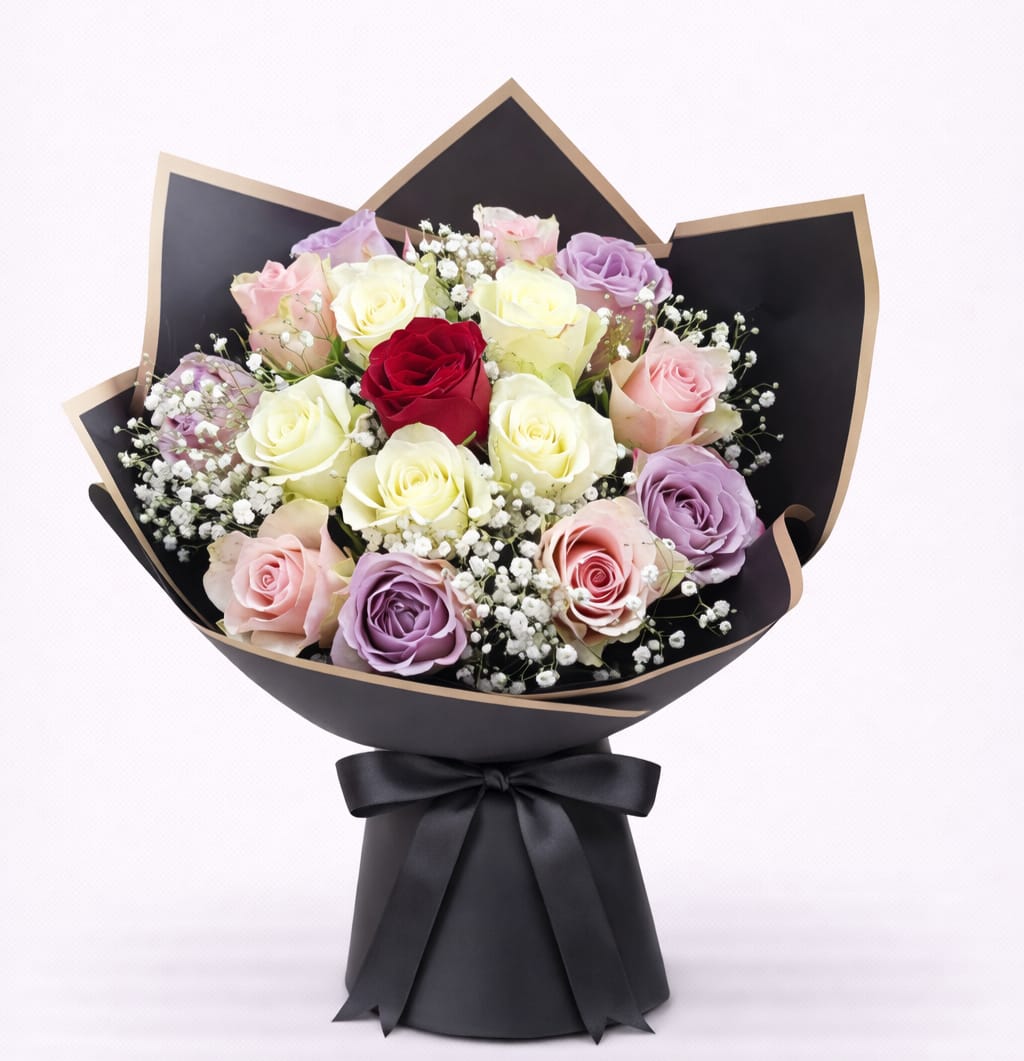 Karışık Gül Buketi, farklı renklerdeki güllerin uyumlu bir araya gelmesiyle
