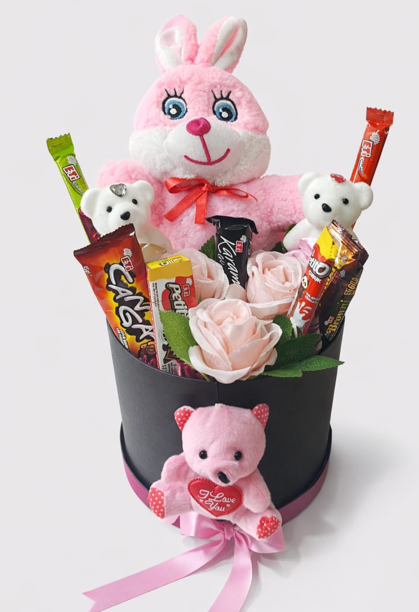Merkezde yer alan büyük pembe peluş tavşan aranjmana sıcak ve neşeli bir hava katarken,